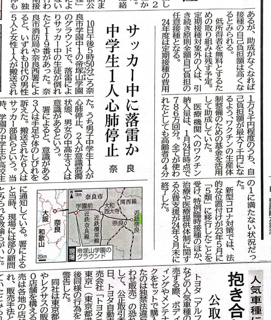 サッカー中に落雷事故